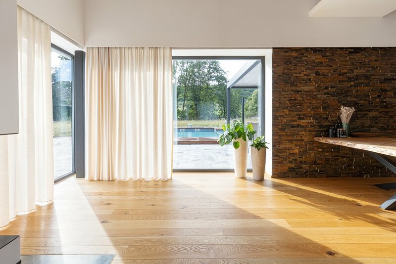 Díky širokému výběru ze 200 látek různého vzoru, barev, hustoty a průsvitnosti si závěsy vybere téměř každý. Nabídka zahrnuje jak závěsy zastiňující a zatemňující, tak transparentní, dostupné v různých typech skládání a řasení. Jednoduchý sklad je ideální pro velké prostory a moderní interiéry – umožňuje látce vyniknout a podtrhnout čistý, minimalistický design. Šířka závěsu přes 6 metrů zaručuje efektní vzhled a možnost využít látku naplno, aniž by prostor působil přeplácaně. Transparentní varianty přitom dodávají místnosti lehkost a světlo.