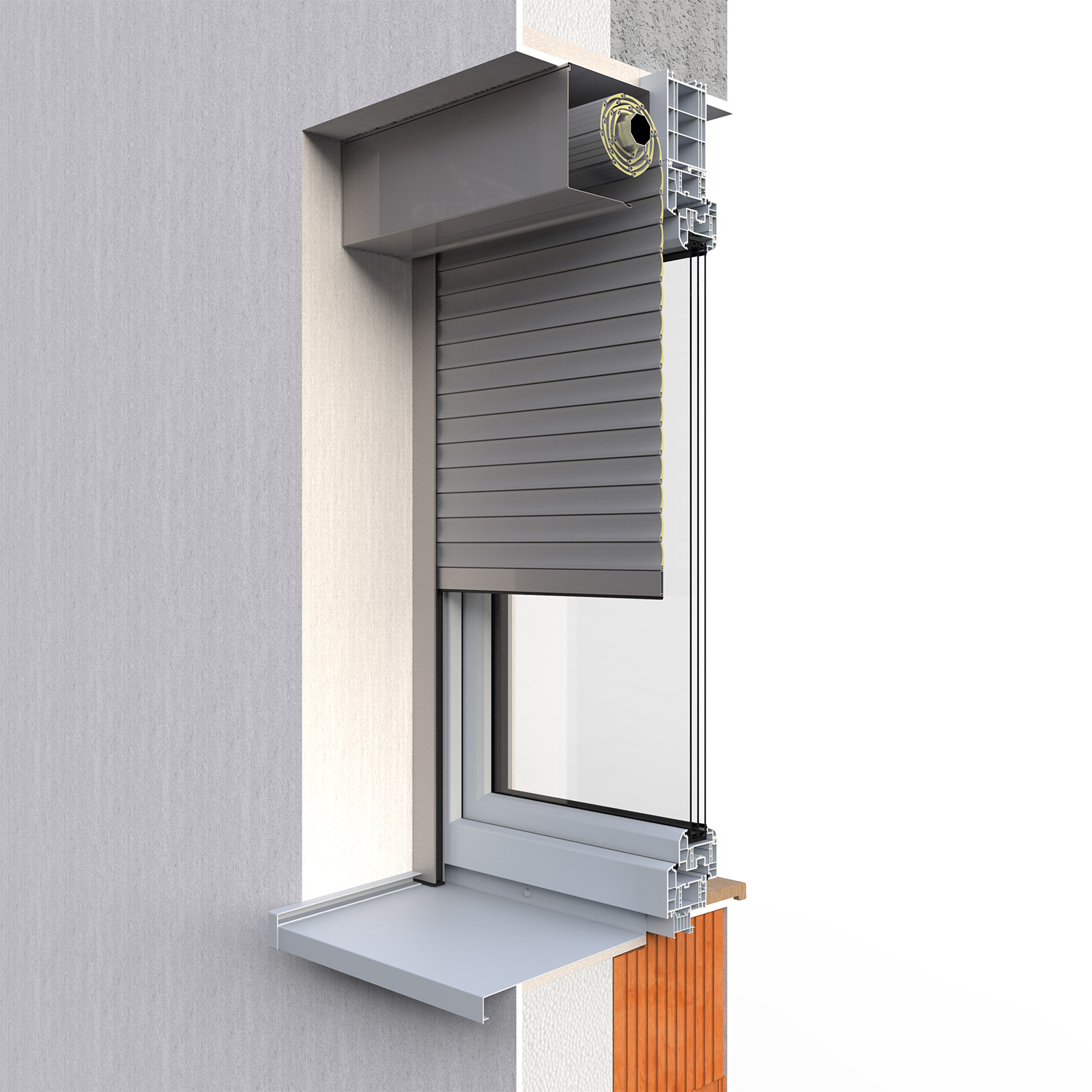 Návin lamel venkovní hliníkové rolety je skrytý v podomítkovém boxu, který se instaluje přímo na zdivo, vyrovná se zateplovacími panely a poté zaomítne. Toto elegantní a čisté řešení je ideální pro novostavby i rekonstrukce.